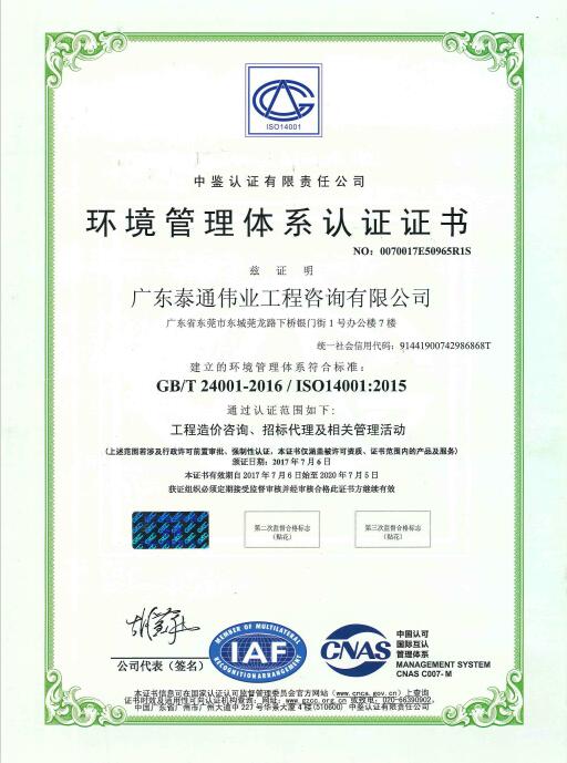 > 资质荣誉 > ISO14001环境管理体系认证证书(中文版)